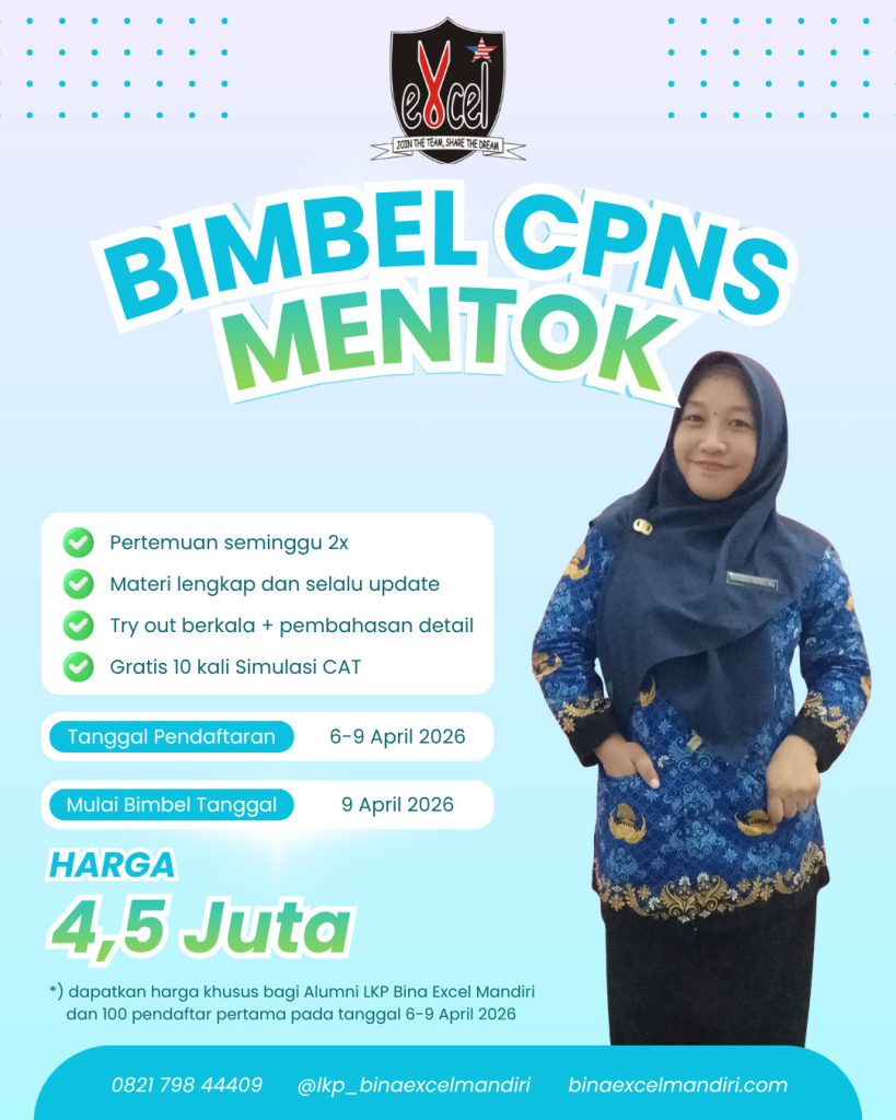 Kali ini LKP Bina Excel Mandiri kembali membuka bimbingan belajar khusus persiapan tes CPNS dan Sekolah Kedinasan ya…